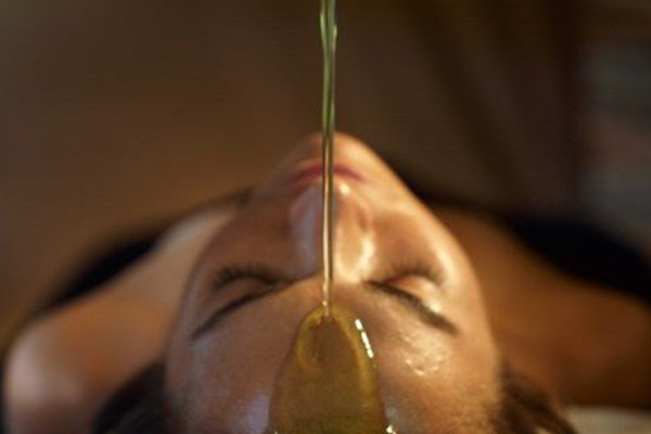 02. A stream of warm herbal decoction/oil is poured onto the person’s forehead. Vibrations are created on the forehead by the constant stream of oil. The oil penetrates deep down into the nervous system after saturating the forehead and scalp. The oils used in this procedure improve blood circulation to the brain by the vasodilation of all the channels.